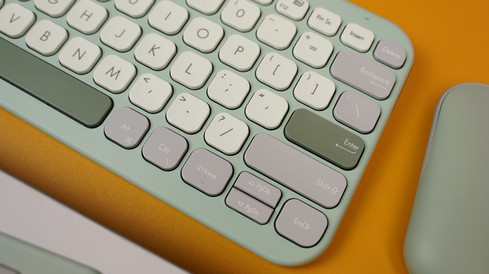 为了方便携带,ASUS 这款 Marshmallow KW100 键盘小巧轻便,重量只有374.8g。配色方面则分成了抹茶绿及燕麦奶两种配色,而小编手上的便是抹茶绿版本的 KW100 键盘。按键大致上采用了米色和灰色的分布,但用户常使用的 Esc,Enter和空白件则是使用了深绿色,提升可见度。