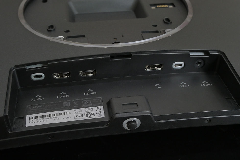显示屏后方是接口的部分,从左到右分别是USB Type C充电接口,两个HDMI 2.0,Display Port1.4,全功能Type C接口(USB3.2GEN1,支持USB 2.0,DisplayPort 1.4 HBR3,USB PD充电协议),还有一个3.5mm 音频输入接口。此外, MateView GT 具有双麦克风智能拾音功能,可以做到回声消除、背景降噪,满足在线游戏和直播的需求。