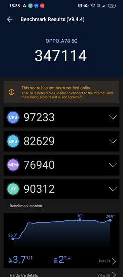 为了测试 OPPO A78 5G 的性能,小编在此使用了安兔兔评测软件及两款游戏来为这款手机进行性能测试。首先,手机在开启性能模式之前的跑分是 347,114,开启性能模式后则是 373,944。在此看来性能模式确实提升了接近10%左右的性能,如果用户不介意高电池消耗的话,可以考虑在游戏时开启性能模式。